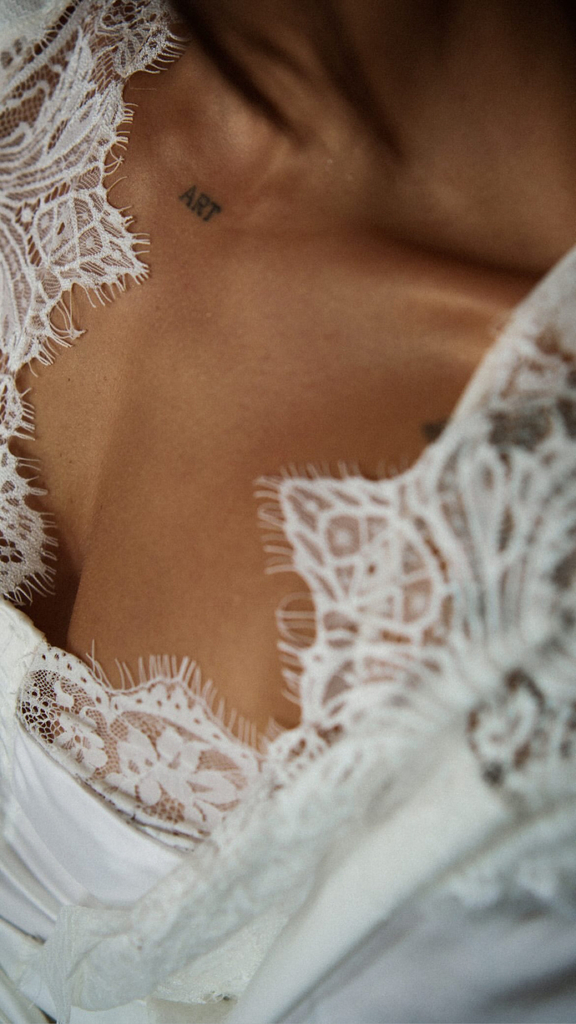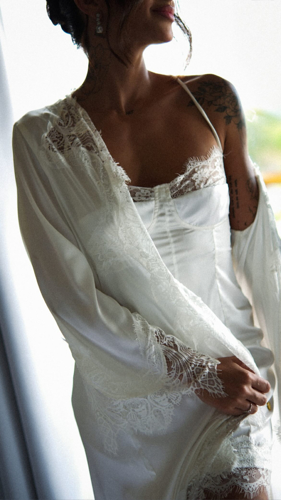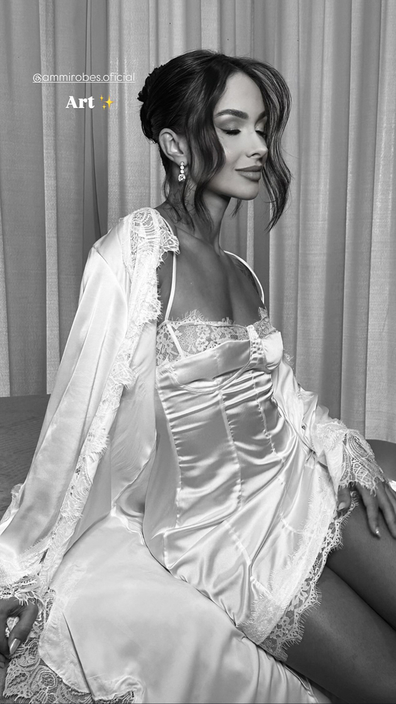 Já o Robe Versailles complementa o look com sua fluidez. Feito em seda gloss, este robe conta com um acabamento em renda chantilly e mangas flare, trazendo um charme atemporal e delicado.